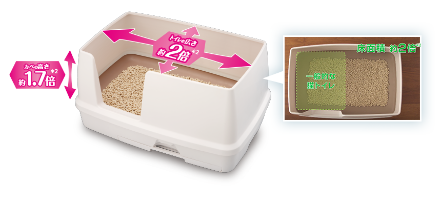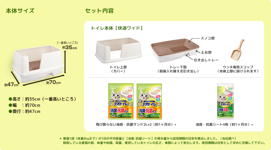 | 商品內含 | 內附:開放型上罩、砂盤、抽屜式尿片底層、貓砂鏟、 Unicharm 64670條狀砂2L×2包、 Unicharm 抗菌消臭尿墊 4片/1包 |