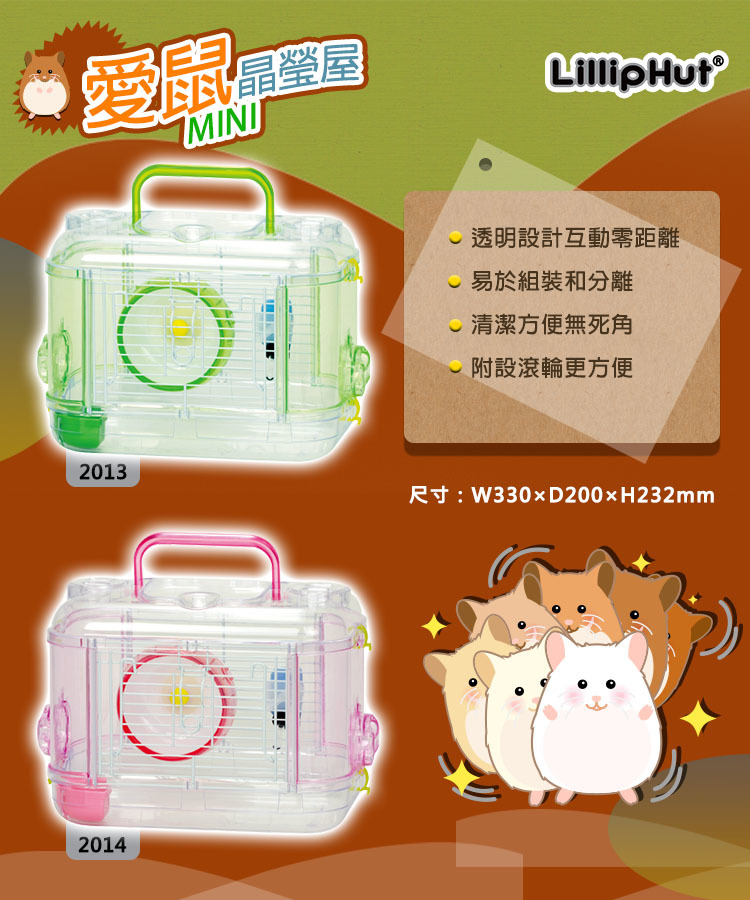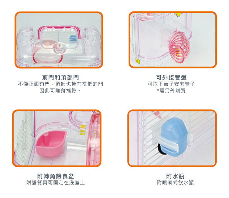 | 【商品說明】 | 組裝方式簡單方便,能快速完成鼠籠。 主要配件相當齊全(跑跑輪、飲水器、食碗),不需另外再買。 全透明外殼設計,方便飼主觀察寵物鼠的狀況。 門扇能牢牢卡住,老鼠不易溜出亂跑。 高底盤不漏屑,不會讓老鼠把木屑都翻出來。 |