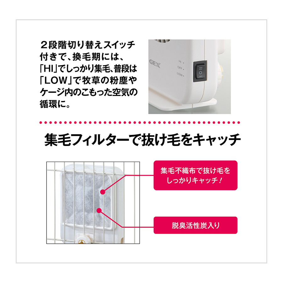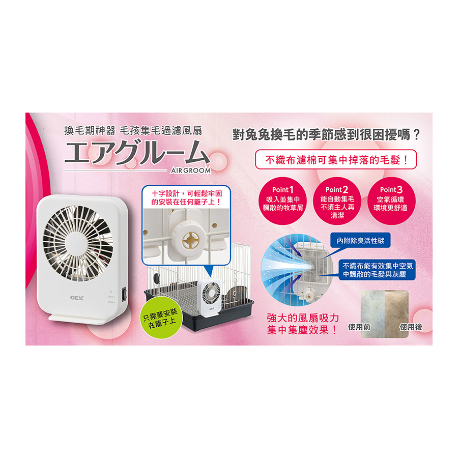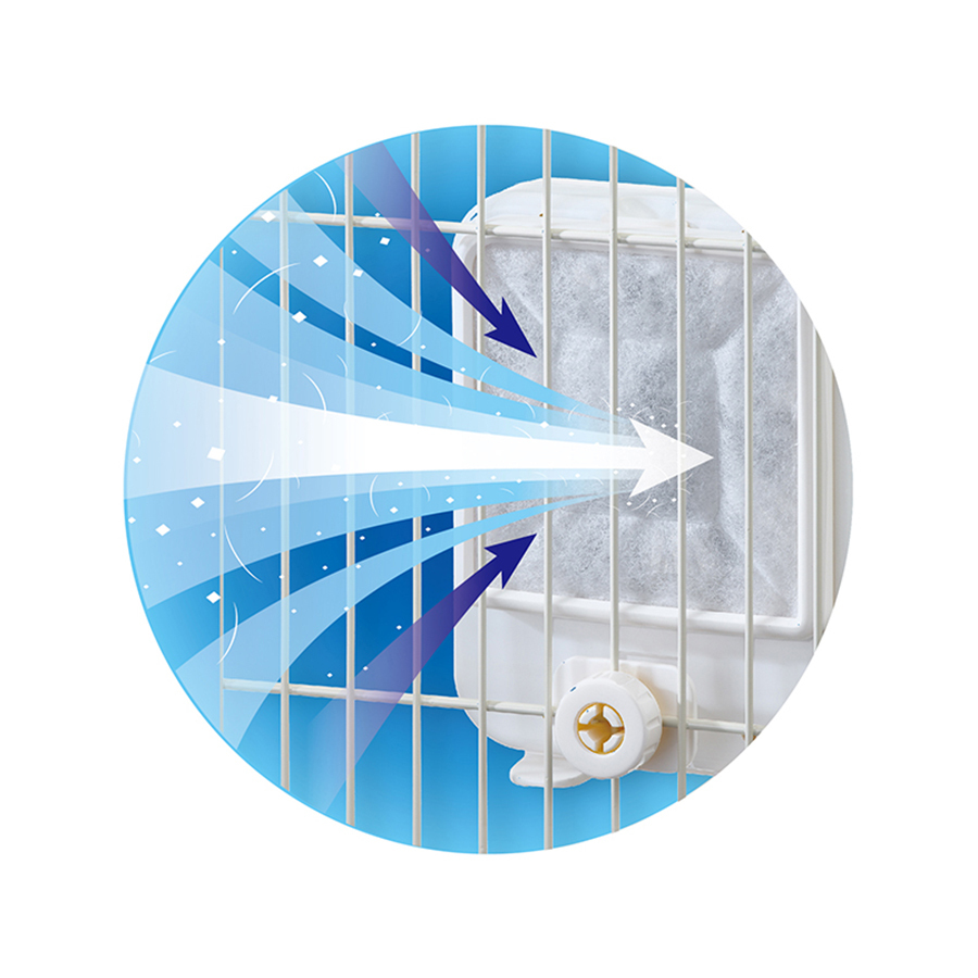 | 【商品說明】 | 只需簡單的安裝就可可以牢牢地抓住小動物換毛時期擾人的掉毛。 只需更換濾棉,清潔最為方便。 透過除臭活性炭濾棉的過濾,環境變得更加舒適與無異味。 1.吸附牧草或是籠內灰塵。 2.吸附換毛期時的擾人大量掉毛。 3.循環空氣讓環境舒適。 |