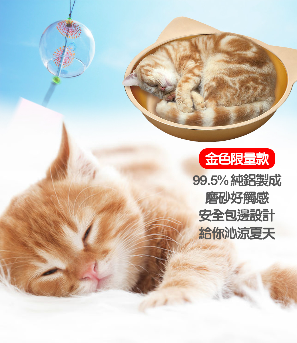 | 商品說明 | 1.超過99.5%的高純度鋁,散熱效果極佳。 2.直徑38公分一隻貓貓剛剛好,小型犬也可以使用 3.一年四季均可使用,冬天可多加上一條毛毯,依舊讓貓貓捨不得起身 4.圓弧造型可包覆貓咪身體 5.邊緣經過拋光處理,不必擔心貓咪會刮傷 6.清洗容易不易耗損可長時間使用,CP值超高 正版商品,超高純度鋁 達99.5%以上,相較仿品擁有極佳的散熱效果。 正版商品底部平整光滑,限量色-金色簡約時尚,讓炎炎夏日更加涼爽。 |