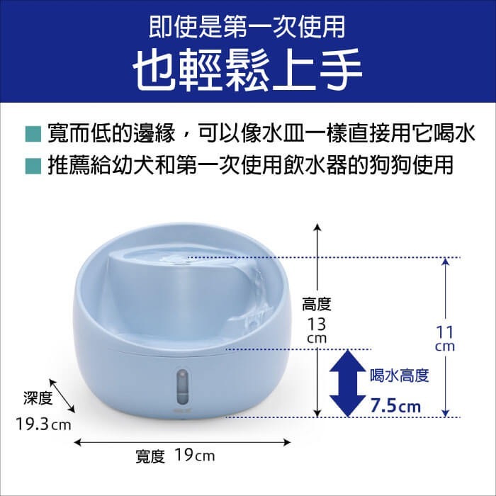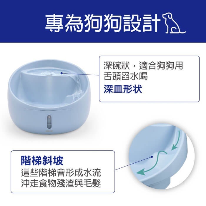 寬而低的飲水口讓狗狗像用碗喝水一樣輕鬆飲水,非常適合小型犬!深碗造型方便狗狗用舌頭舀水,寬而低的飲水口也使其成為初次使用過濾式飲水機的理想之選。