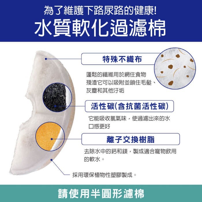 離子技術去除自來水中的鎂和鈣,生成寵物適用的軟水,活性碳吸收氯氣異味,讓水質甘甜可口。