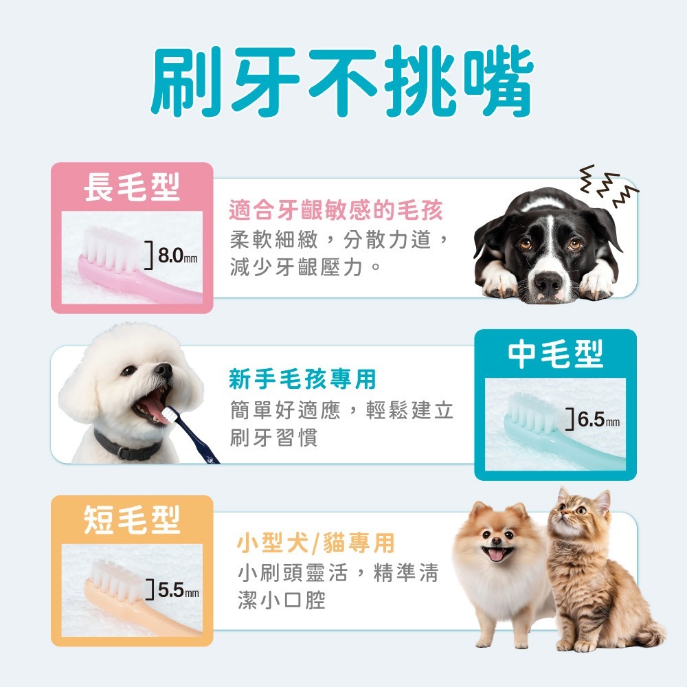 針對犬貓的個體差異,提供多元的牙刷解決方案,方便毛孩潔牙更輕鬆