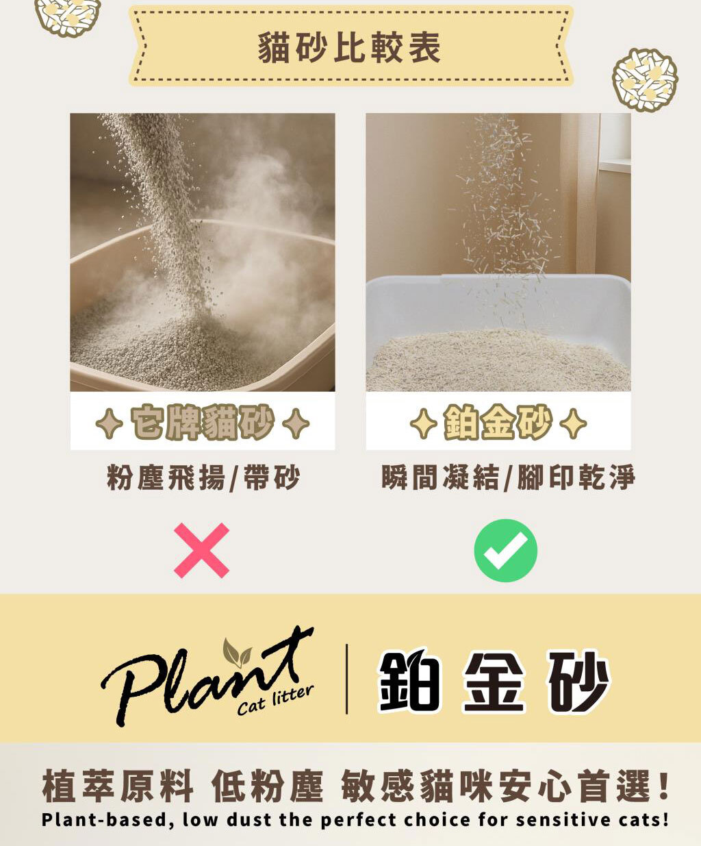 不帶砂:鉑金混合比例有效降低貓咪腳底殘砂,耐踩不易碎